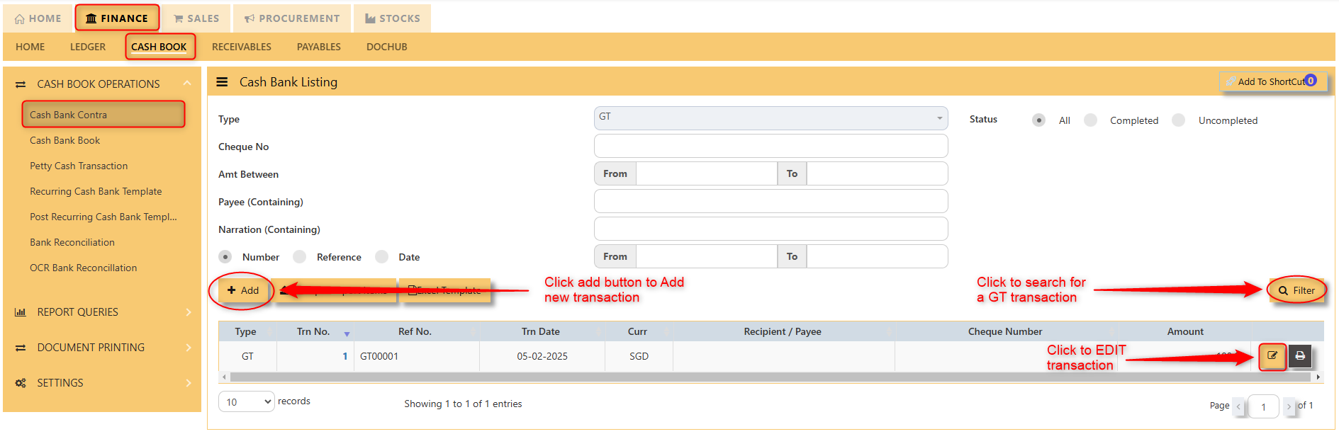 After clicking the cash/bank book button, you will see the GC transactions, wherein you can add new transactions, search existing GC transactions, and edit them if needed.