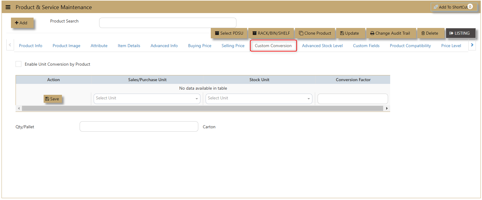 Click on Stock– Product Management – Conversion Factors icon for following screen. Take note that this setting is for general conversion which will apply to all the products.