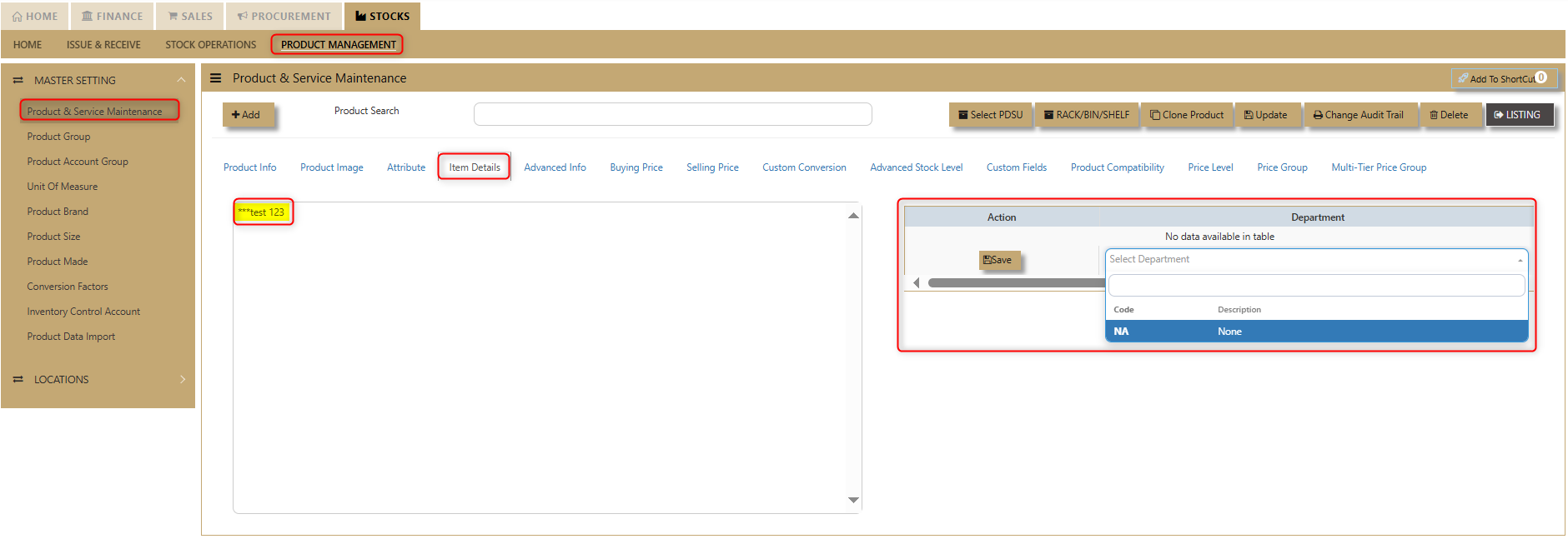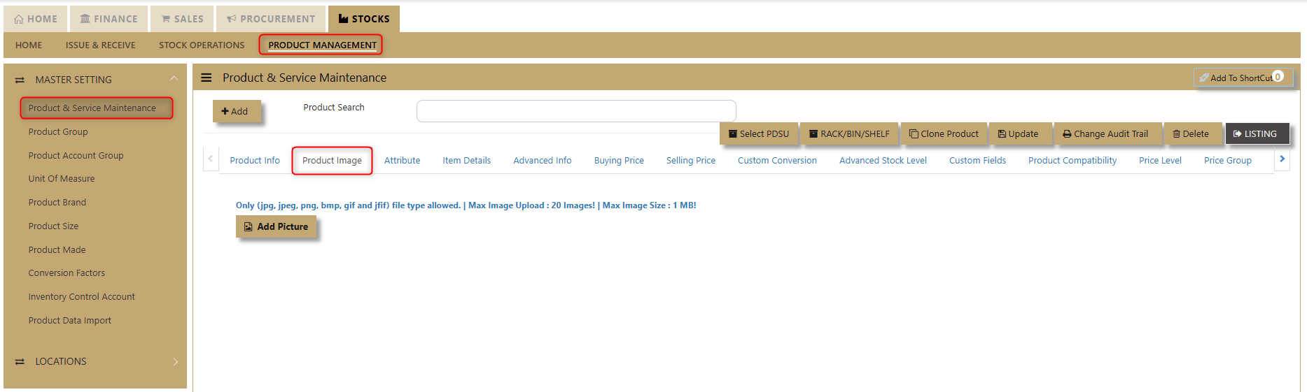 1. Click on Stock– Product Management – Product & Service Maintenance icon for following Inventory listing screen.