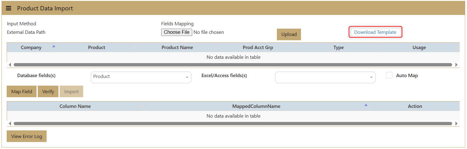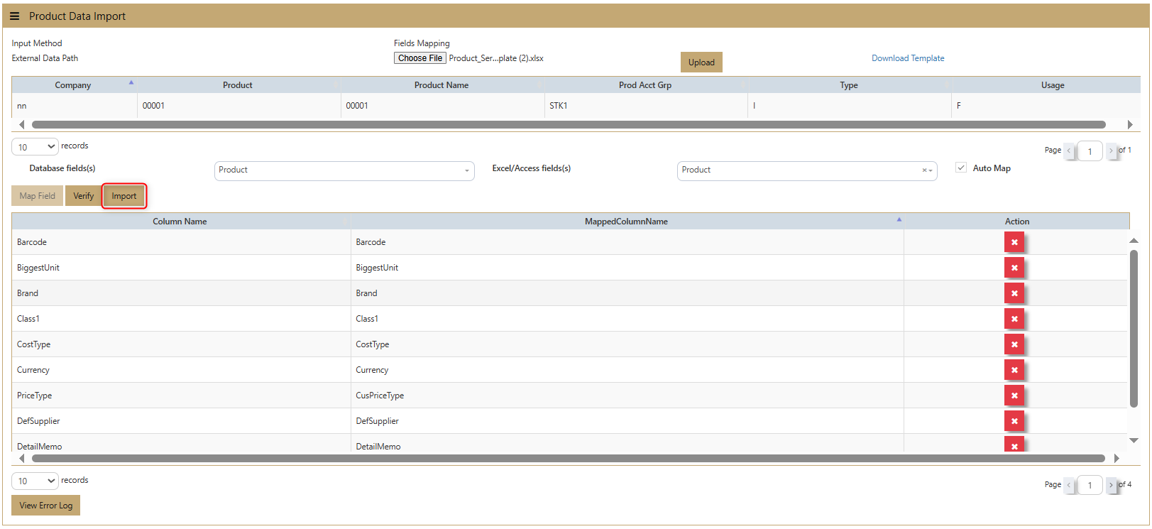 Review Upload: After importing, the system will show the column names, mapped column names, and actions of the uploaded Excel file. Users can verify the successful upload of the product data in the Product & Service Maintenance section of the system.
