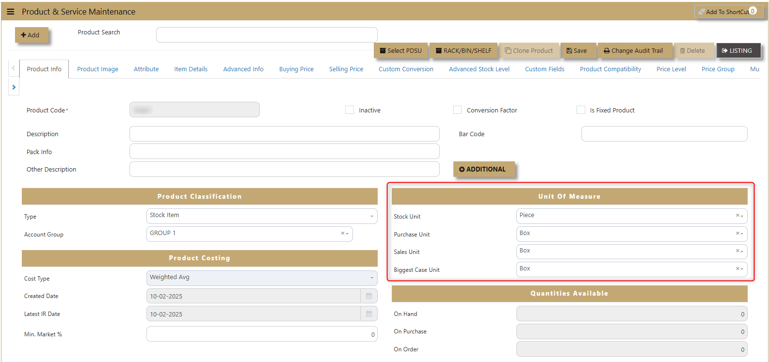 4. Product Info - Unit of Measure (UOM) UNIQ365 used to quantify and track products, such as pieces, boxes, or kilograms. It ensures consistency in inventory management, allowing seamless conversion between units for accurate tracking, pricing, and reporting. This also has its own maintenance tab.