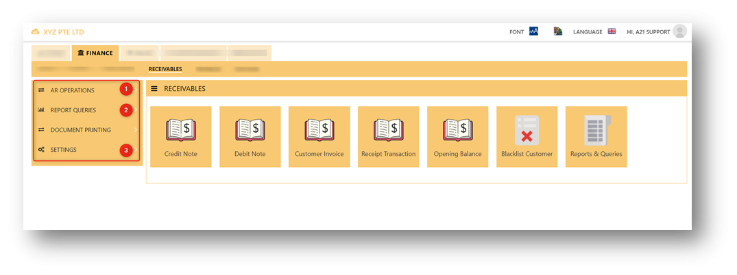 The RECEIVABLE MODULE has 3 tabs, as shown above, namely, Operations, Report Queries, and Settings.