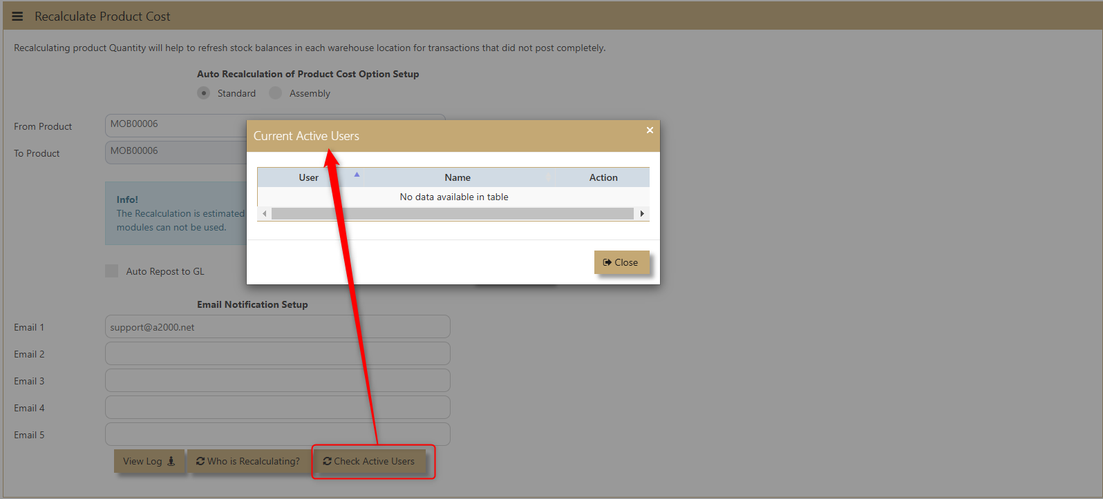 2. When doing a Standard Product Recalculation, we need to make sure that all users are log out in the system. Otherwise, the recalculation will not be going to proceed. The system will have to check first if there is no OPERATIONS, MOBILE User Type that is log on the system as it will affect inventory. When the system is on the mode to perform a recalculation, these user types need to logout in the system. The Email Notification Setup – this will auto populate and the system will auto get the email of the user who will perform the recalculation.