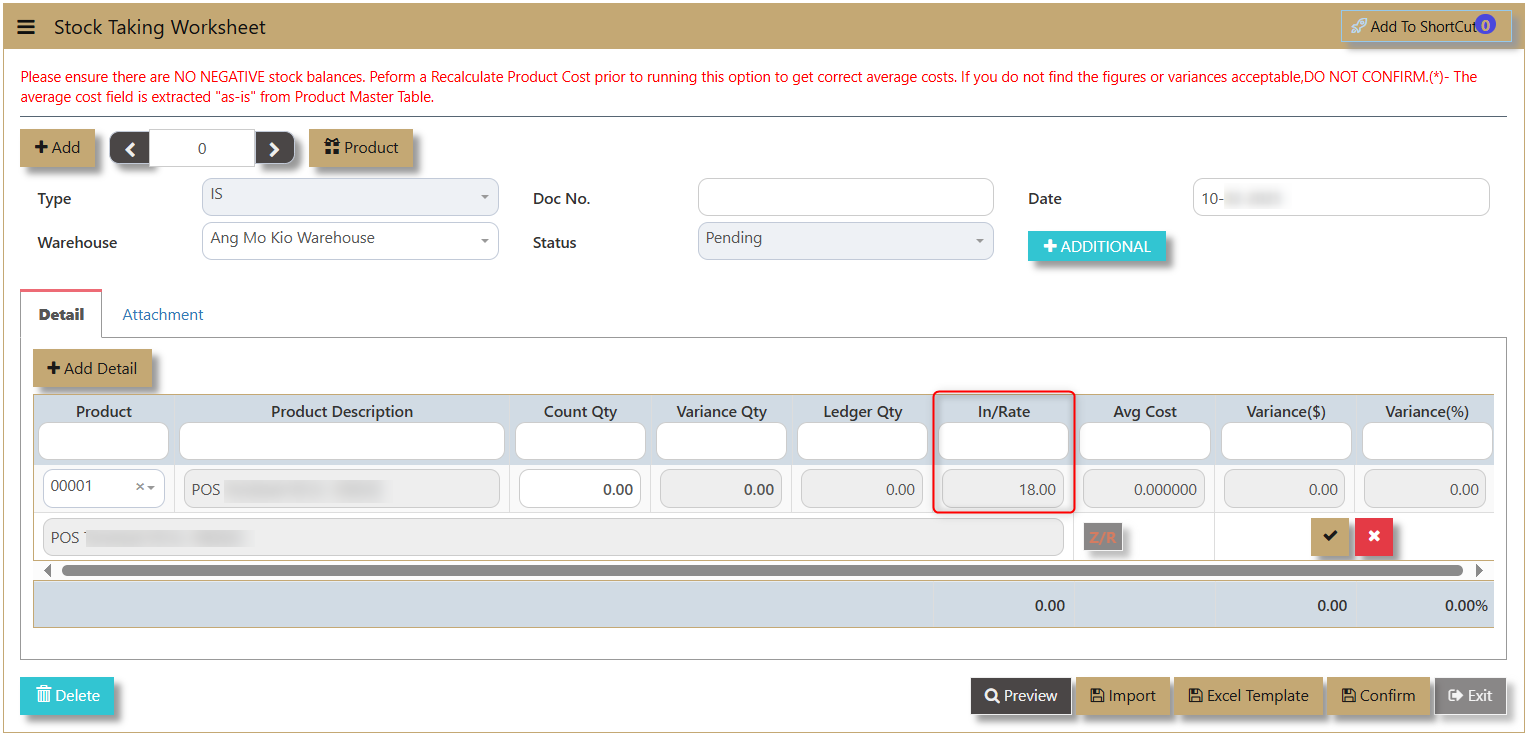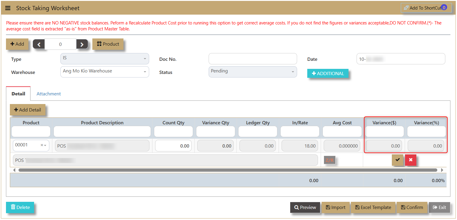 This function is normally done after a physical stock take is done. After affirming the stock quantity, the user can key in the actual count quantity, after which the user can confirm the stock status by clicking on the “Confirm Now” button. Do note that once the confirm button is clicked, there is no way to reverse the action unless another Stock take is created.