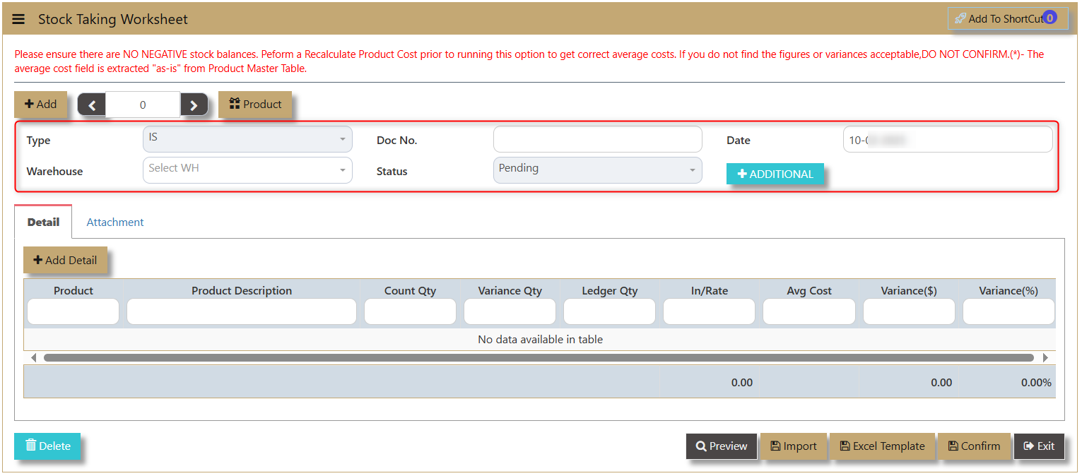 Important: Before conducting this option, it is important to note the following pre-requisites to the stocktaking.